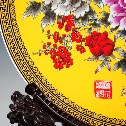 40cm diameter yellow background peony flower porcelain hanging plate